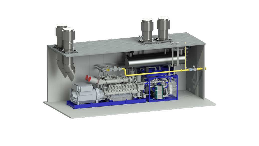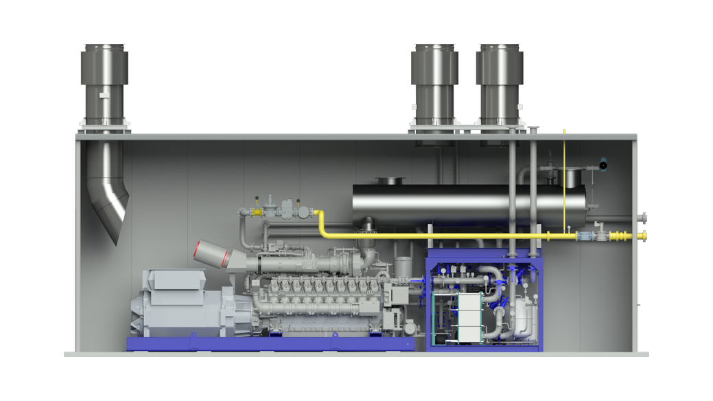 За выработку электрической энергии отвечает газопоршневый двигатель. Но этого недостаточно для работы, данной системой нужно управлять, питать и передавать электрическую энергию потребителям, обеспечить подачу воздуха на горение, вентиляцию машинного зала, обеспечить двигатель газом. А также, как и любой другой двигатель, газопоршневая установка требует охлаждения.