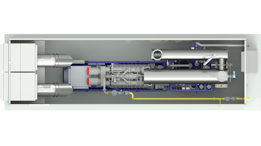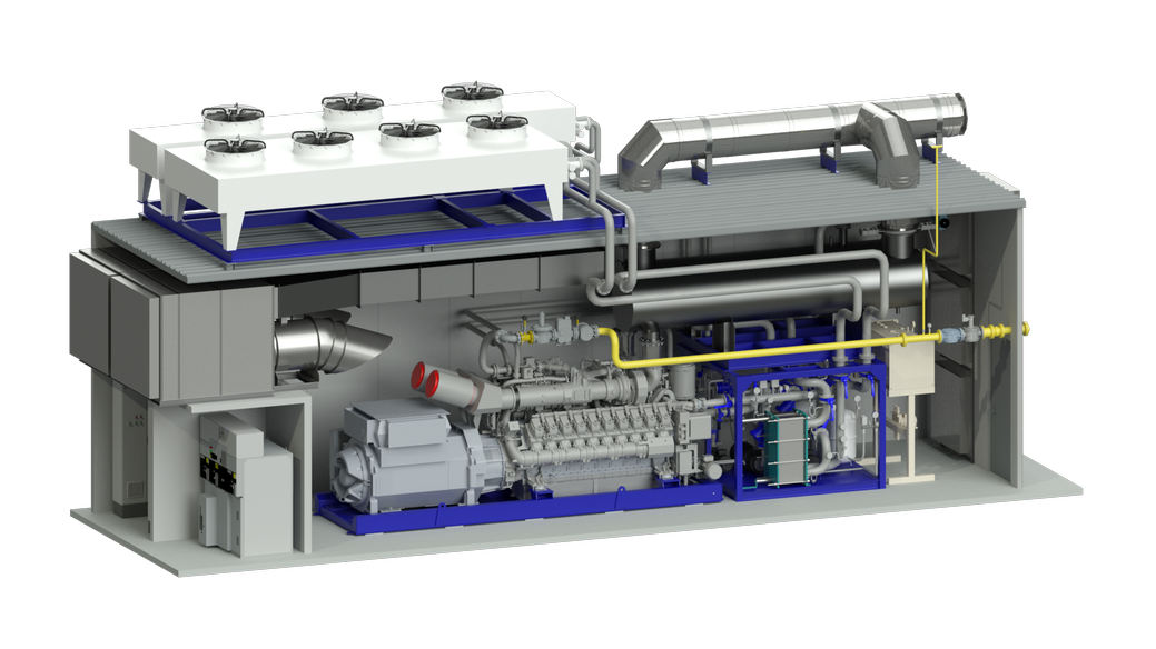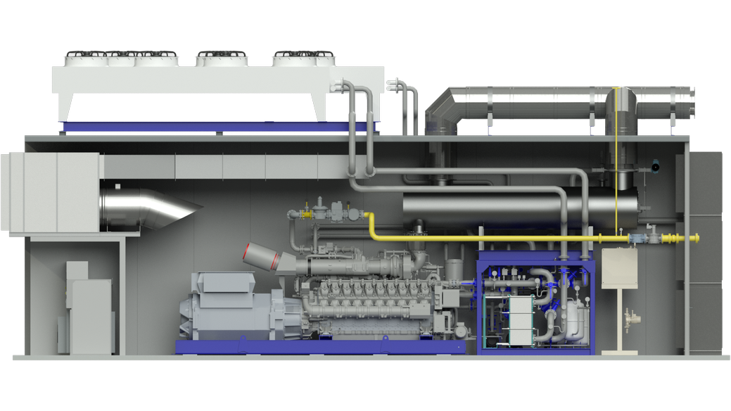 - Система охлаждения ГПУ с системой утилизации тепла с рубашки двигателя и выхлопных газов. В данном случае тепло, производимое двигателем, утилизируется через пластинчатый теплообменник, тепло дымовых газов через котел утилизатор. Подробнее с данным решением можно ознакомиться в разделе «Варианты утилизации тепла», раздел «Горячая вода» и «Холод». В случае необходимости, охлаждение двигателя осуществляется через одноконтурный радиатор охлаждения.